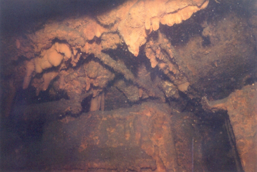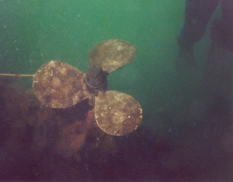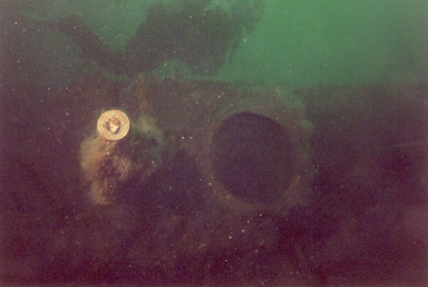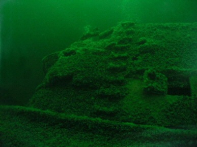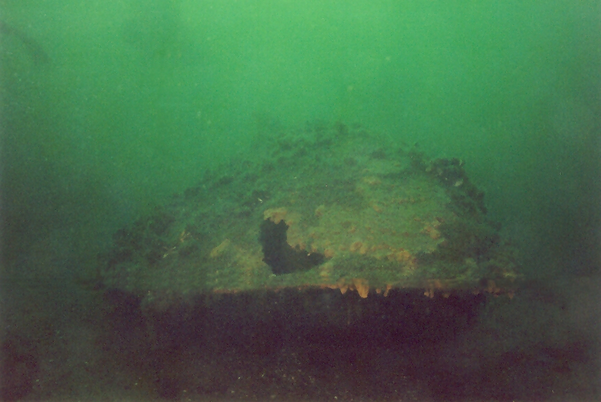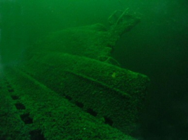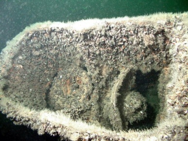 Blick frontal auf den backbordseitig liegenden Rumpf